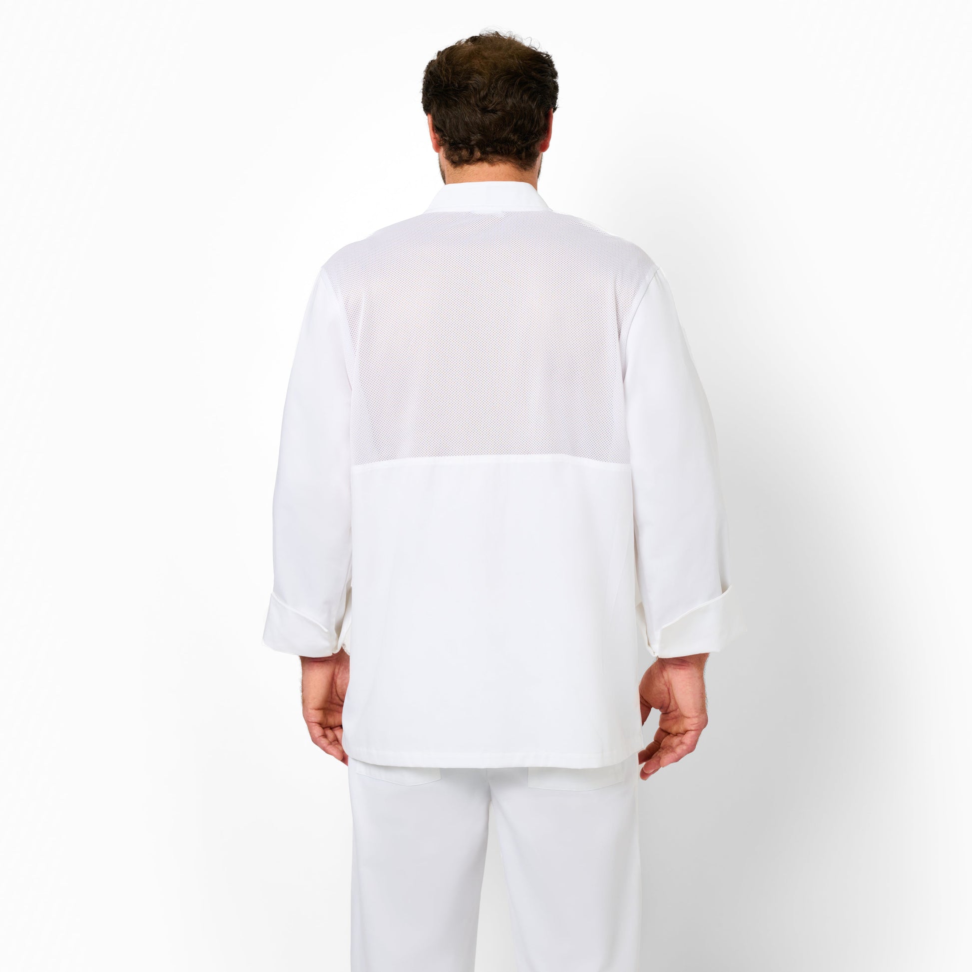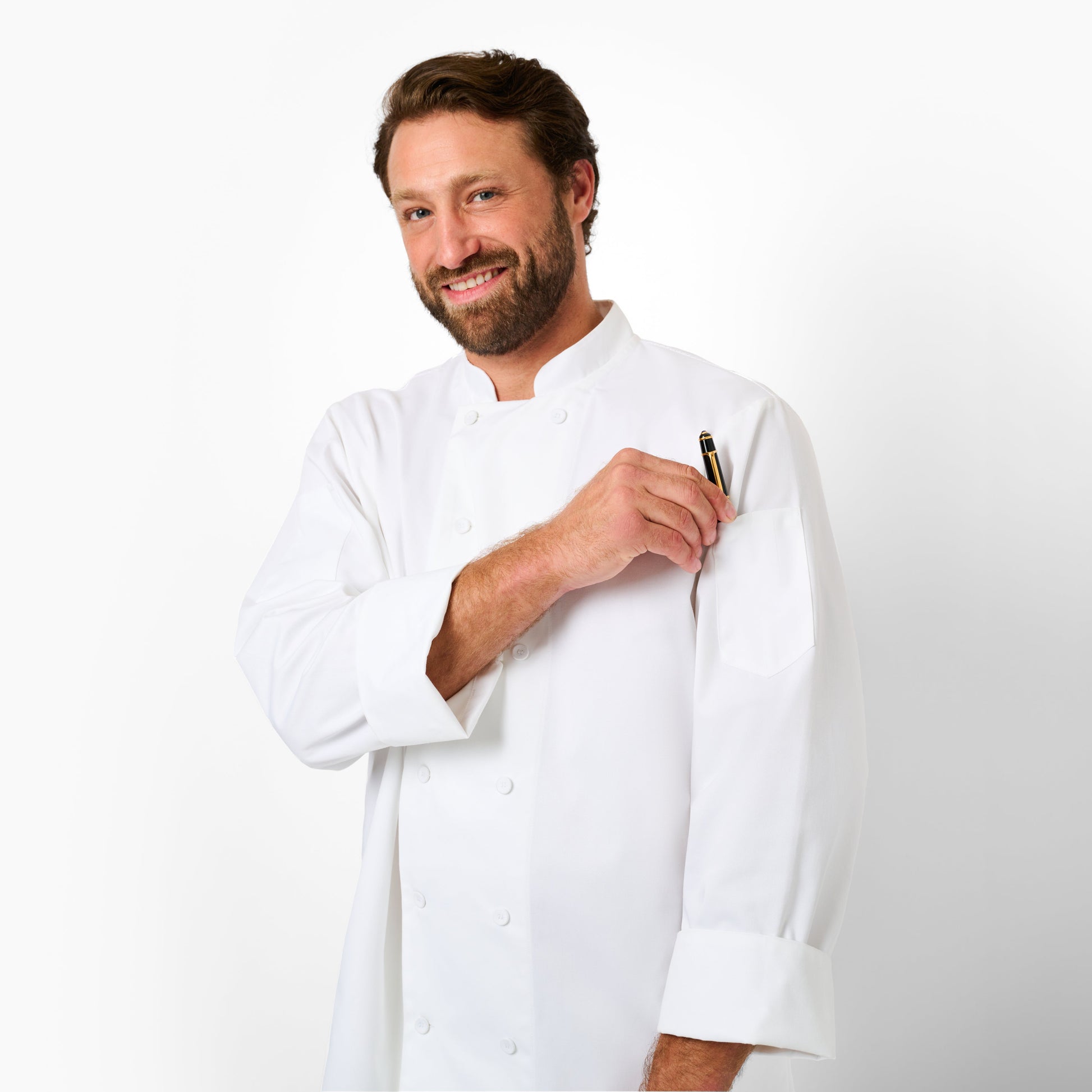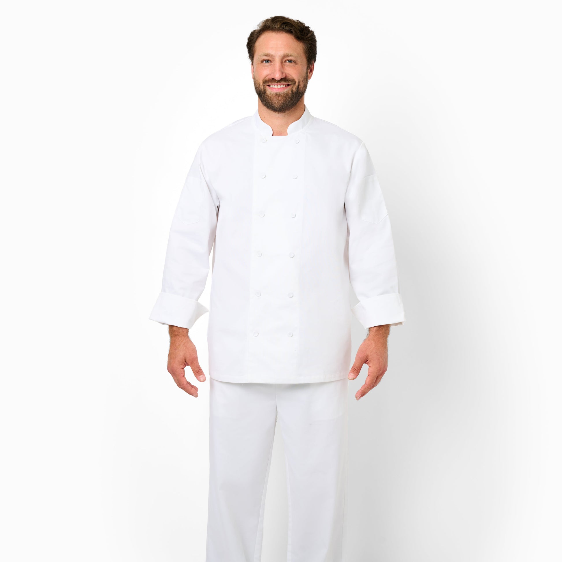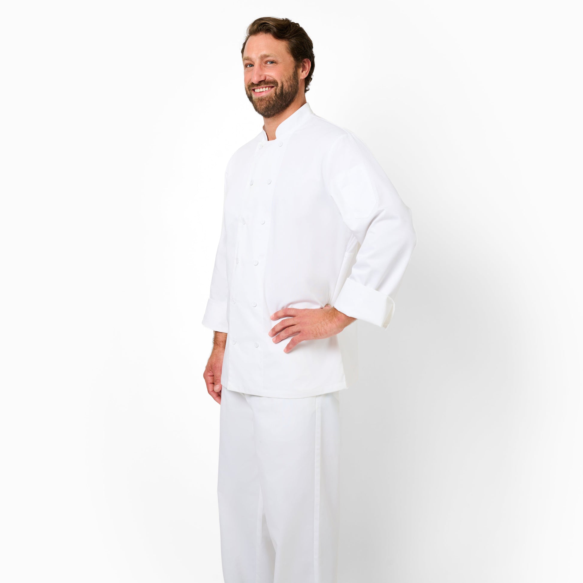 Update your chef attire with this jacket that is made up of 65% polyester and 35% cotton. This stylish coat comes with an attractive knot button front and a handy thermometer pocket on the sleeve. This fabric is exquisite for chefs who need to work a lot with heat and flames.